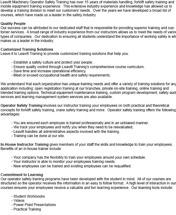 Our substantial number of programs should ensure that you will discover the right one for you or your workforce. Additionally, we offer you two options for training. We can provide it on-site or at our place of business. Our ability to tailor our instruction methods to your equipment is what sets us apart from our competition.